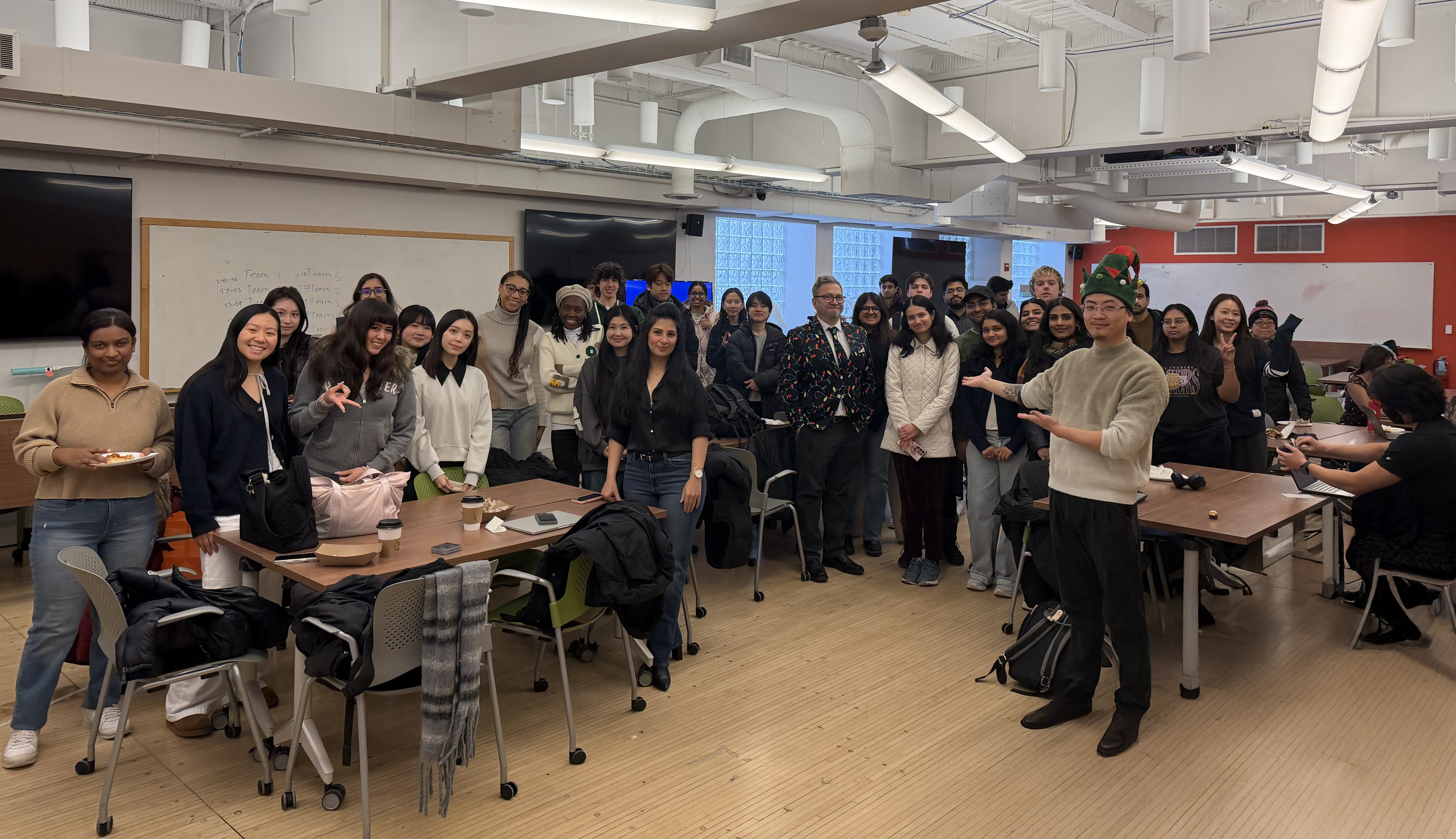 Design of AI Products class photo, I was near the centeral TV, and Leon rocked a holiday hat